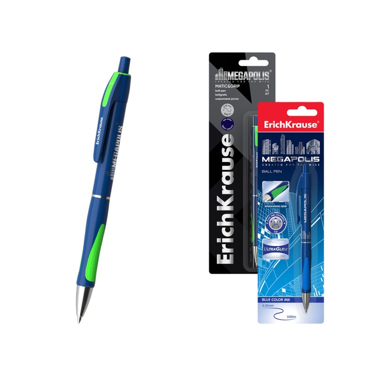 Olovka sa plavim mastilom ErichKrause MEGAPOLIS® Matic&Grip 0.7 je najprodavanija olovka ovog brenda sa uvlačivim dijelom. Njen dizajn uključuje prepoznatljiv patentirani oblik i posebnu Super Glide tehnologiju (mastilo niskog viskoziteta), što omogućava veoma meko i brzo iskustvo pisanja