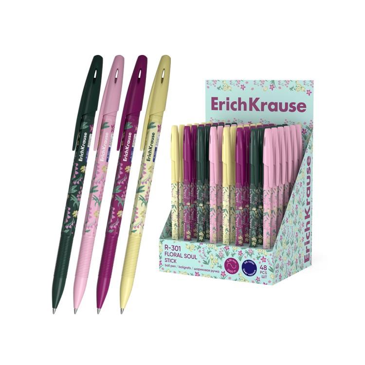 Hemijska olovka ErichKrause R-301 Floral Soul 0.7 – Proizvod je klasična hemijska olovka u obliku štapa sa patentiranim dizajnom i modernim cvijetnim dezenom iz serije Floral Soul. Proizvod je namijenjen za svakodnevnu upotrebu u školama, kancelarijama i kod kuće. Hemijska ima prednost visokog kapaciteta pisanja i udobnosti korišćenja